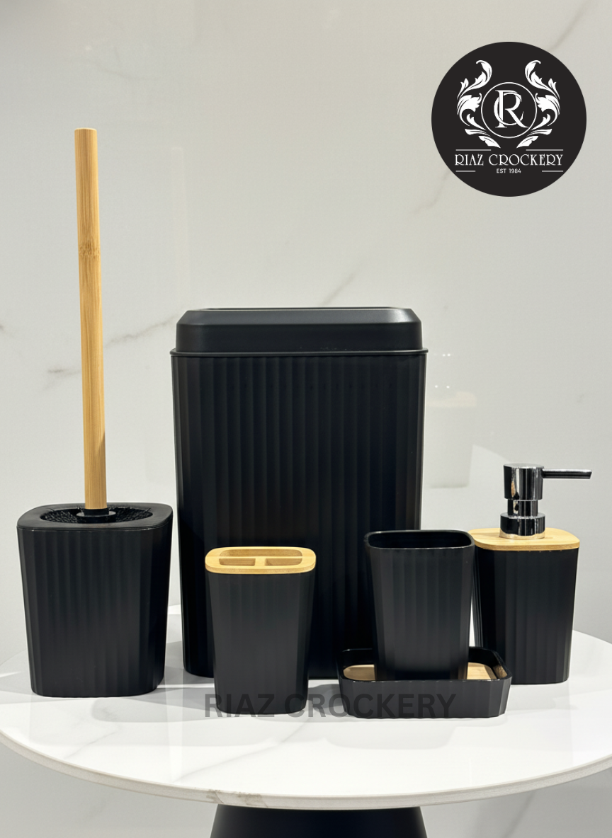 This sleek black bathroom set is made from strong ABS plastic, perfect for a modern and tidy look. Each piece has a subtle ribbed texture and warm bamboo accents. The set includes a toilet brush, a large waste bin, a toothbrush holder, a rinse cup, a soap dispenser, and a soap tray. It's a durable and stylish way to keep your bathroom organized and looking great.