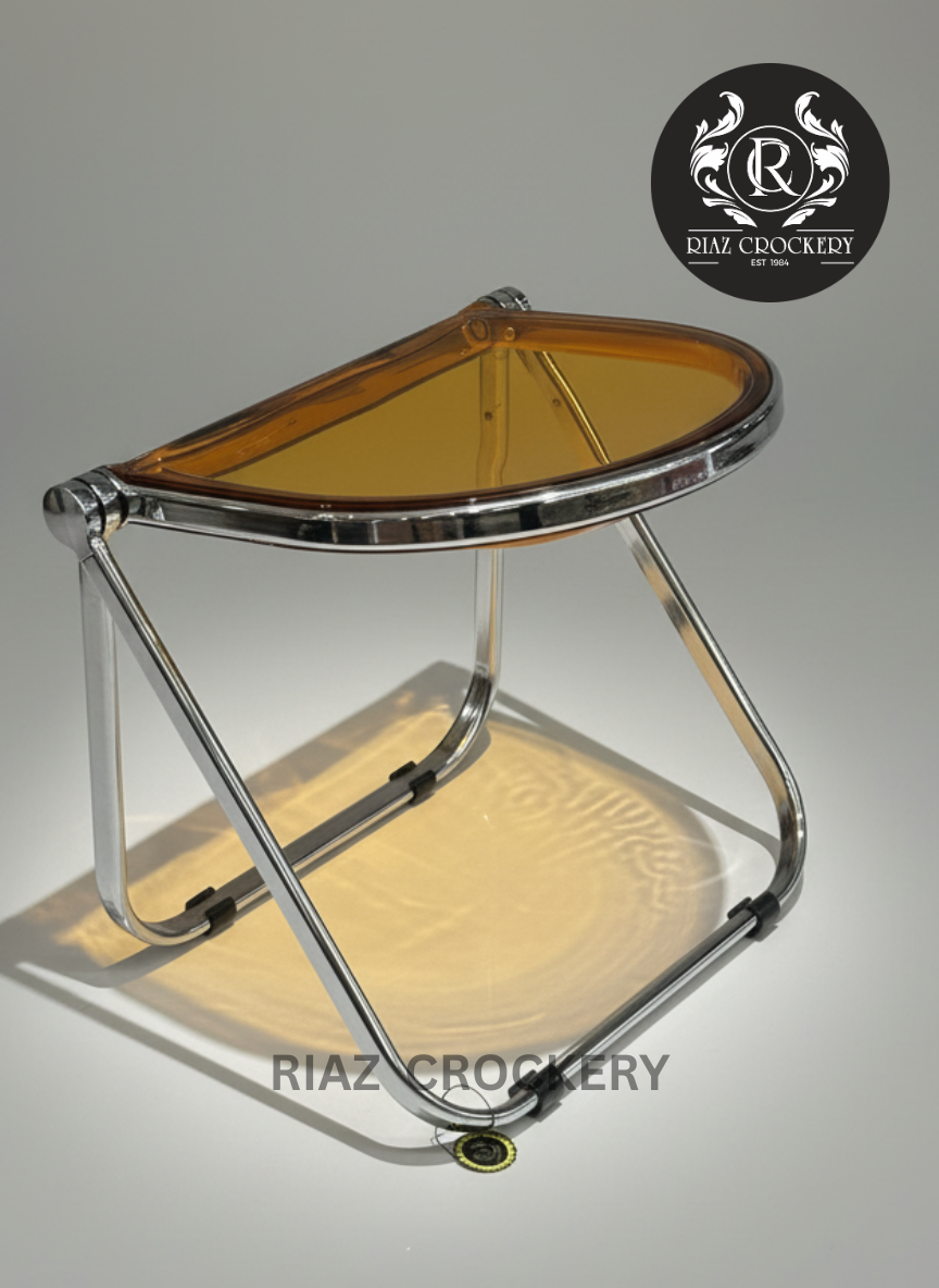 This is a really cool and smart chair that's easy to store. It's made from clear orange plastic and shiny silver metal. The chair has a special design that lets it fold up, so you can put it away when you don't need it. The orange top has a neat curved shape and lets light shine through, making pretty shadows on the floor. It's a great chair for adding a bright, modern touch to any room, and it's super handy because you can fold it.