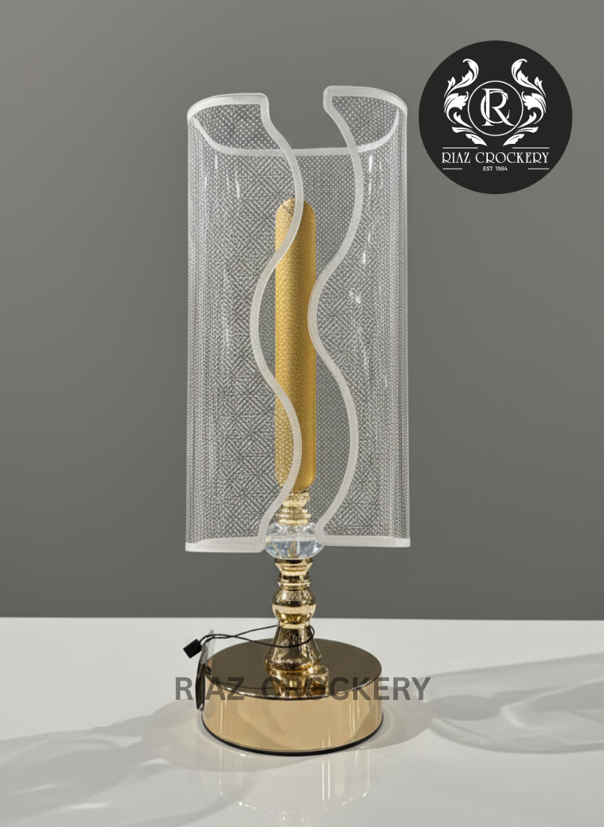 This stylish table lamp brings modern elegance with a warm, inviting glow. It features a beautiful golden base and stand, accented with crystal, all topped by a clear acrylic shade with a unique wavy pattern. Inside, a warm, candle-like light creates a sophisticated ambiance in any room.