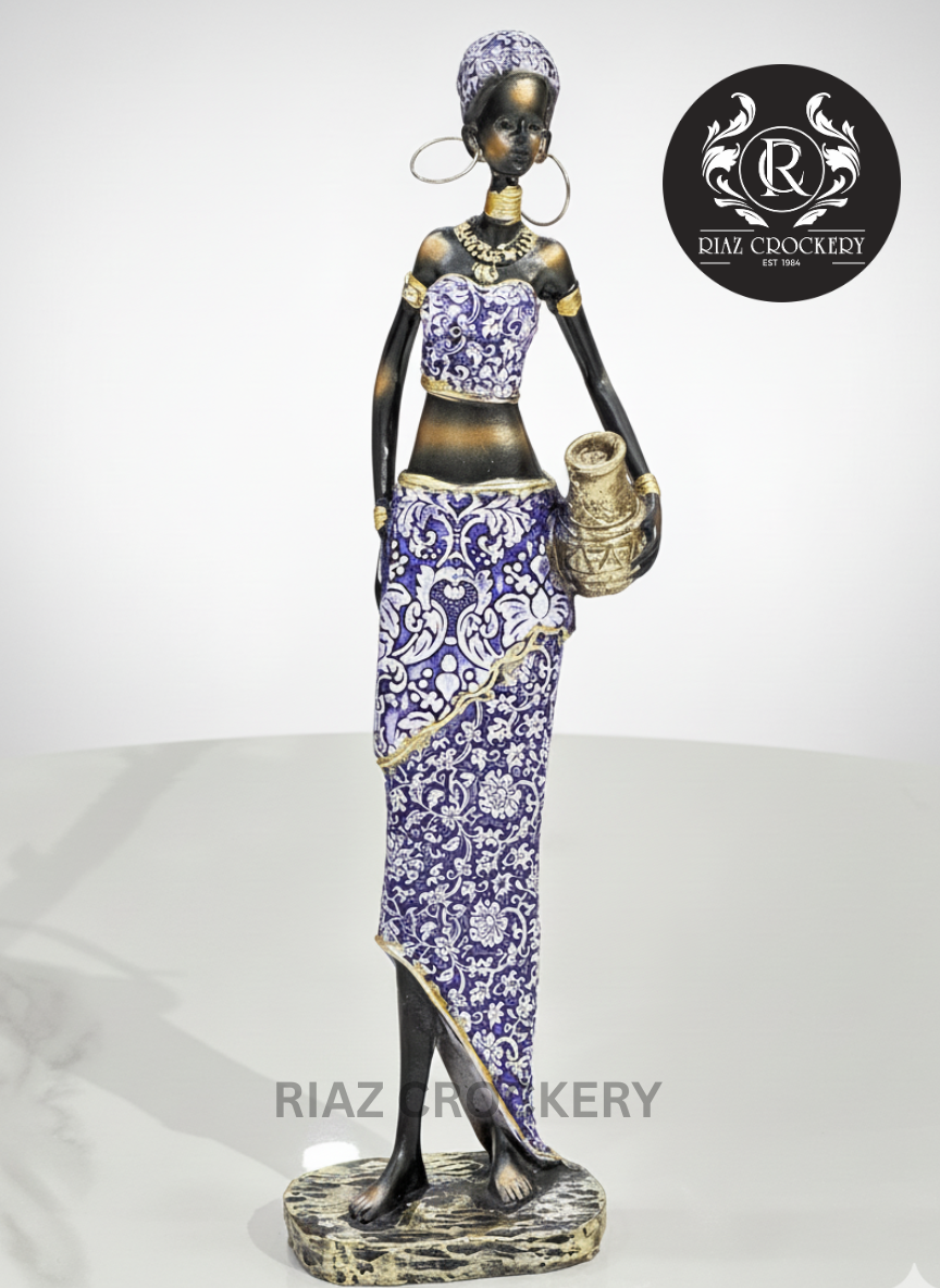This pretty doll shows an African woman dressed in purple and white patterns. She has gold jewelry like big earrings and a necklace, and she holds a gold pot. She stands tall on a rough-looking base. This doll is a lovely piece of art that makes any room feel special.