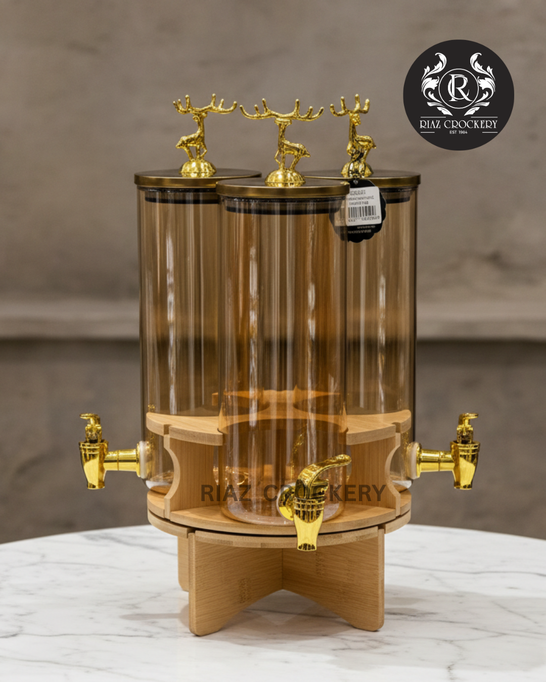 Introducing the "AMIRA ROTATING " Juice Dispenser, a majestic 3-piece set that combines striking design with practical functionality for an unforgettable beverage experience. This unique dispenser features three tall, clear cylindrical containers, each crafted from elegant amber-toned glass, allowing the rich hues of your beverages to be beautifully displayed. Each cylinder is topped with a gleaming golden lid, from which a magnificent golden deer or stag figurine proudly emerges, serving as a distinctive and regal finial.