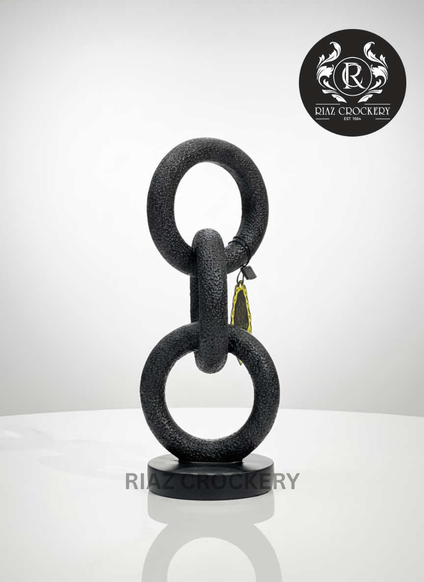Add a touch of modern cool to your home with this unique black chain link statue. It features three big, round links that are connected, giving it a strong and interesting look. The statue has a cool textured finish and stands firmly on a simple round black base. It's a great piece to make any table or shelf look more stylish and modern!