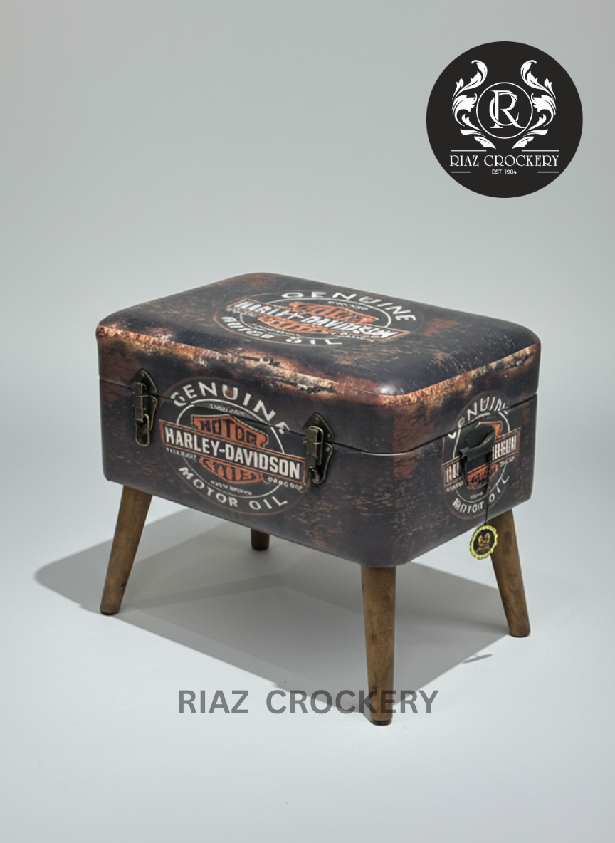 This is a really cool and unique Vintage Harley-Davidson Storage Box. It's designed to look like an old, rustic trunk with classic Harley-Davidson motor oil logos and an aged, distressed finish. The padded top opens up for hidden storage and also works as a comfy seat or footrest. It sits on sturdy wooden legs and has cool antique-style metal latches, adding a rugged, retro touch and extra tidy space to any room.