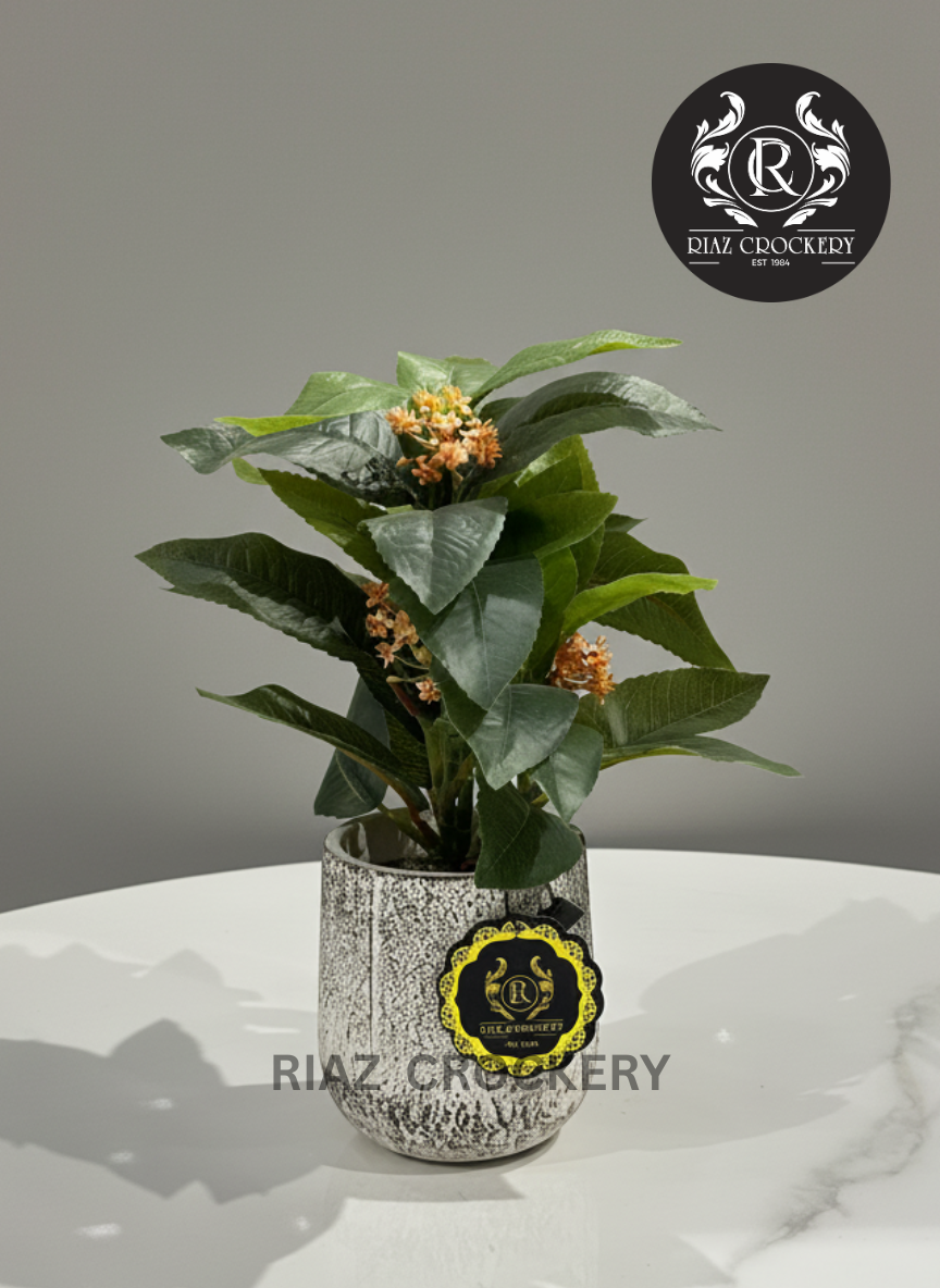 This Artificial Plant with a Cool Pot is a super easy way to make your room look pretty! It has nice green leaves and tiny orange-yellow flowers, all in a special grey and white pot that looks like carved stone. No need to water it, so it always looks fresh and adds a natural, fancy touch anywhere you put it.