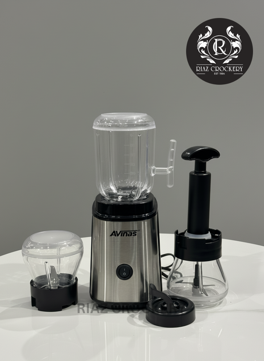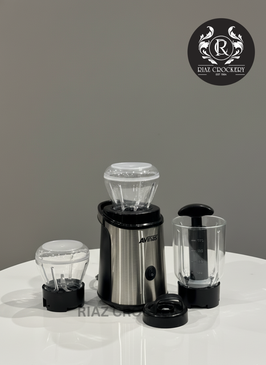 This sleek silver and black Avinas blender is a 3-in-1 star! It can blend your favorite smoothies, grind fresh coffee or spices, and even juice fruits easily. With just one button, it's super simple to use and saves space in your kitchen. Get ready for quick and tasty meals, drinks, and fresh juices every day!