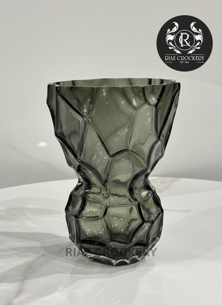 This unique vase is more than just a vase – it's a cool piece of art for your home! It's made from dark, smoky black glass and has a really interesting bumpy, crumpled shape that makes it stand out. It looks great whether you put a few bold flowers in it or just let it sit by itself as a special decoration. It will add a modern and striking touch to any room.