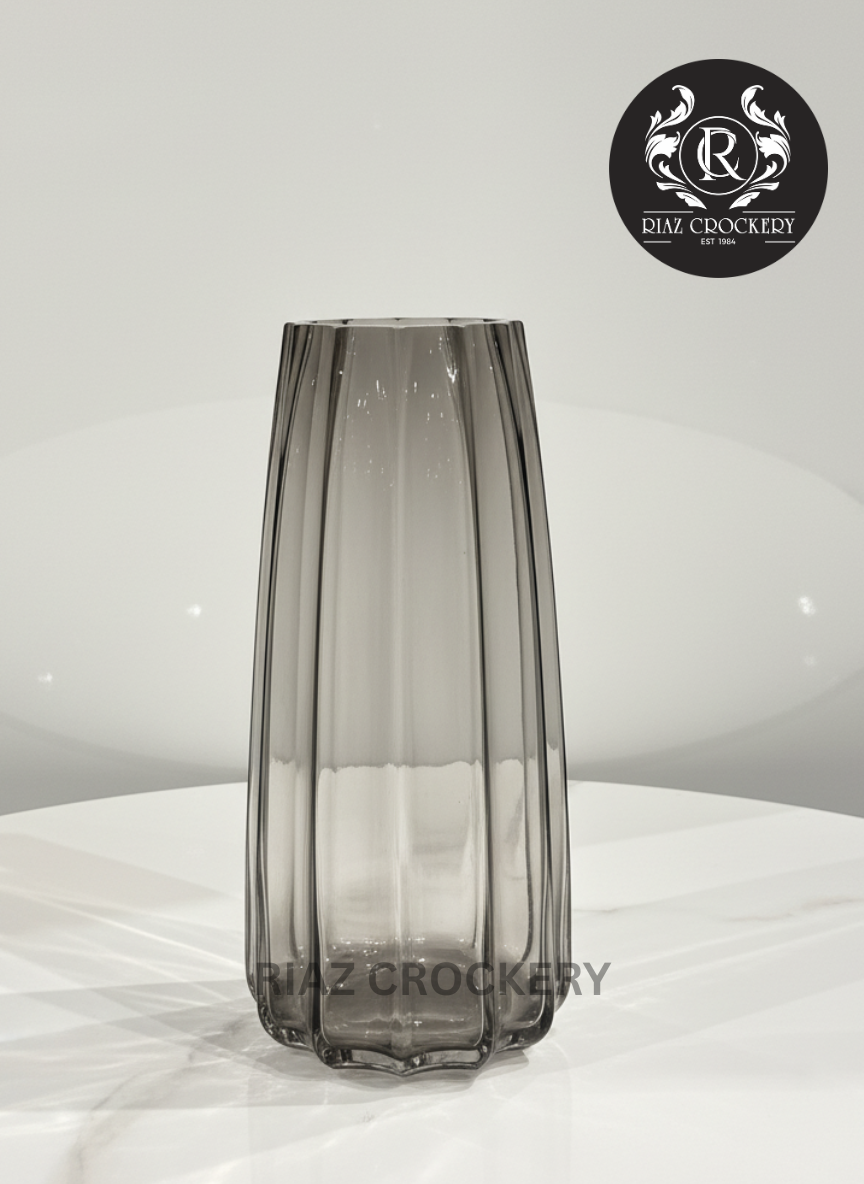 This is a tall, elegant vase made from dark, almost black crystal. It has clean, straight lines running all the way down its sides, like a pleated skirt. It's a classic shape that looks very chic and can hold many types of flowers.