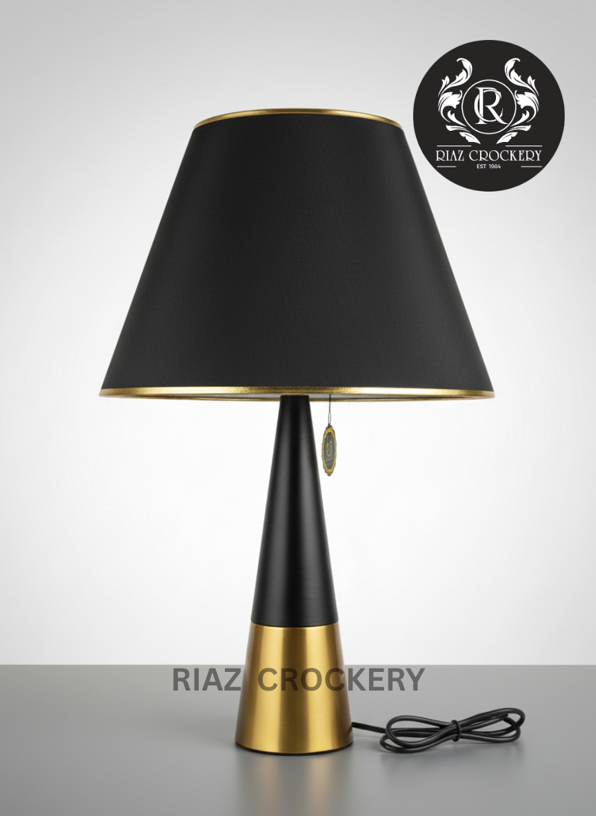 This super stylish table lamp mixes black and gold for a really fancy look. It has a black lampshade with a shiny gold edge, sitting on a cool base that's black on top and bright gold on the bottom. It gives a soft, warm light and makes any room feel special and modern.