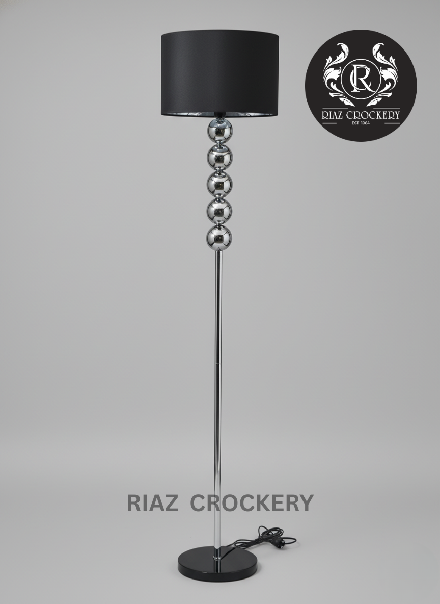 This modern floor lamp features a sleek design with a polished chrome finish. It stands tall with a straight pole, accented by a unique stack of shiny chrome balls in the middle, and is topped with a stylish black drum shade for a contemporary look.
