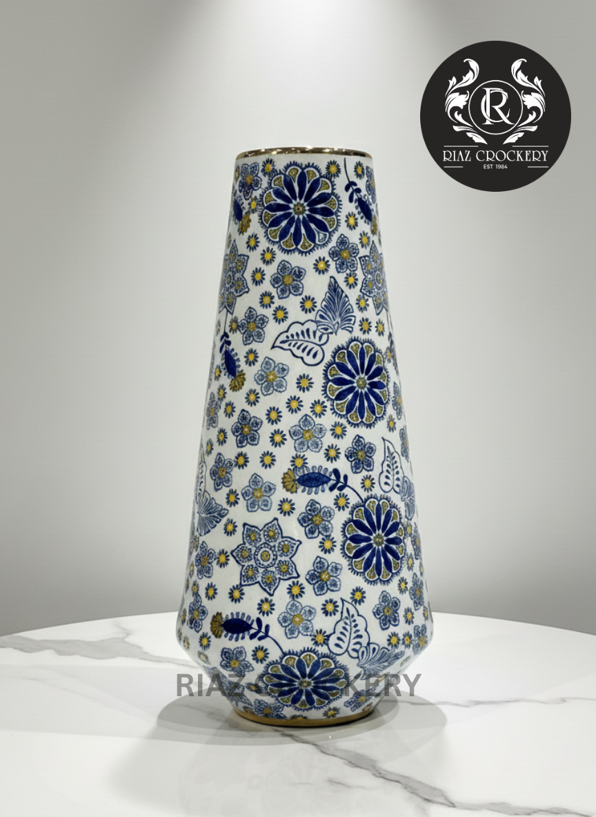 This beautiful vase brings a touch of timeless charm to any room. It features a lovely design adorned with vibrant blue and subtle golden floral patterns, creating an elegant look. The top and base are finished with a delicate touch of gold, adding a hint of luxury. Perfect for displaying your favorite flowers or as a standalone piece of art, this vase is sure to brighten your home.