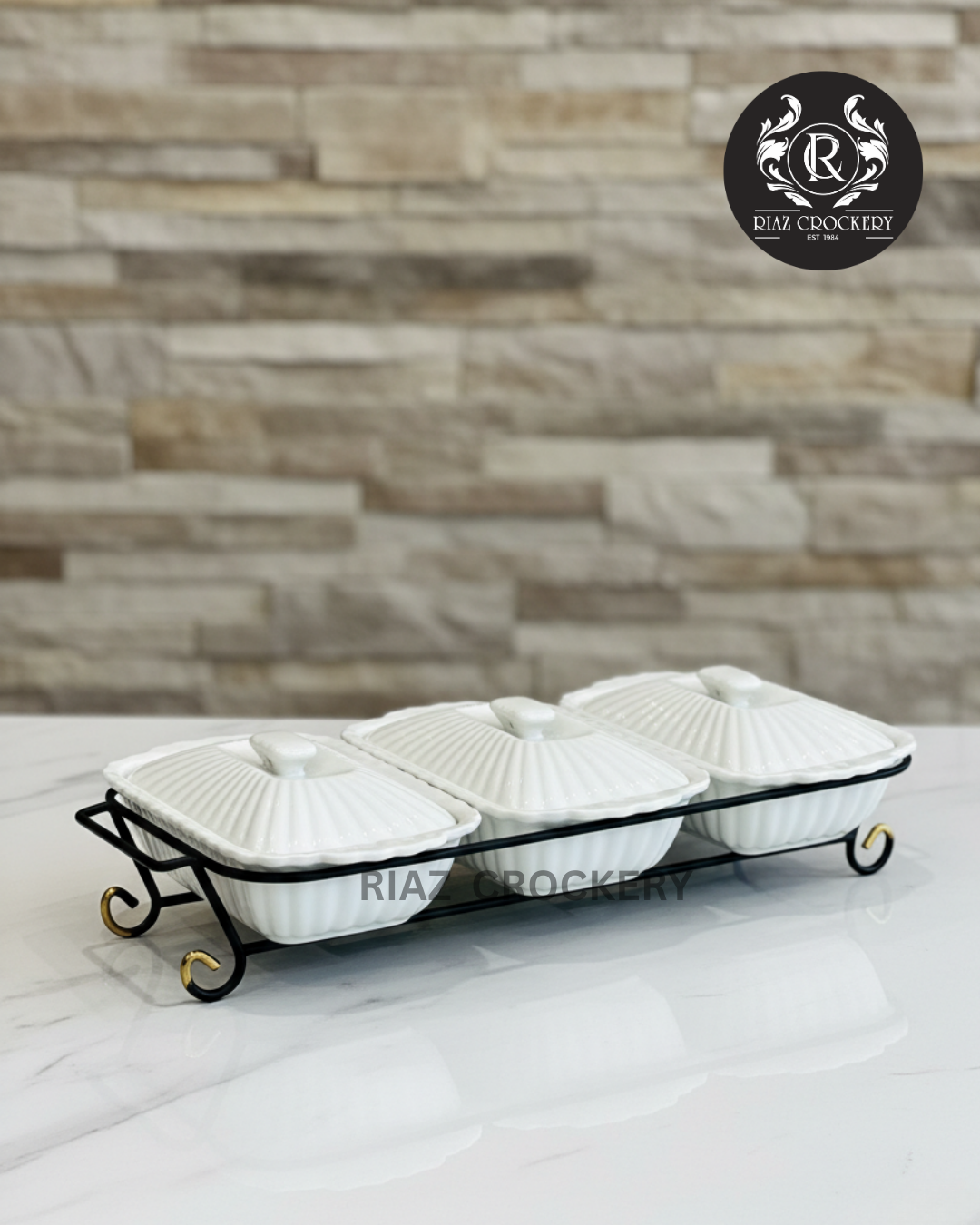 You get three pretty white ceramic casseroles, each with a lovely fluted (ribbed) design and its own matching lid. They sit nicely side-by-side in a simple black metal stand, which has cute little scrolls on the ends. It's a great way to display different foods neatly.