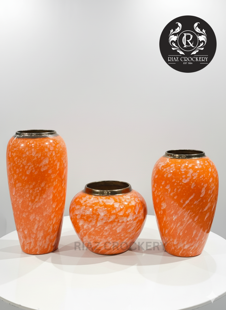 This is a fun and colorful set of three ceramic vases! They are all a bright, cheerful orange color with cool white speckles and streaks, like splashes of paint. Each vase has a shiny dark metal rim at the top. There's a tall one, a round, short one, and another medium-sized one. They look great together and would bring a bright, artistic touch to any room.