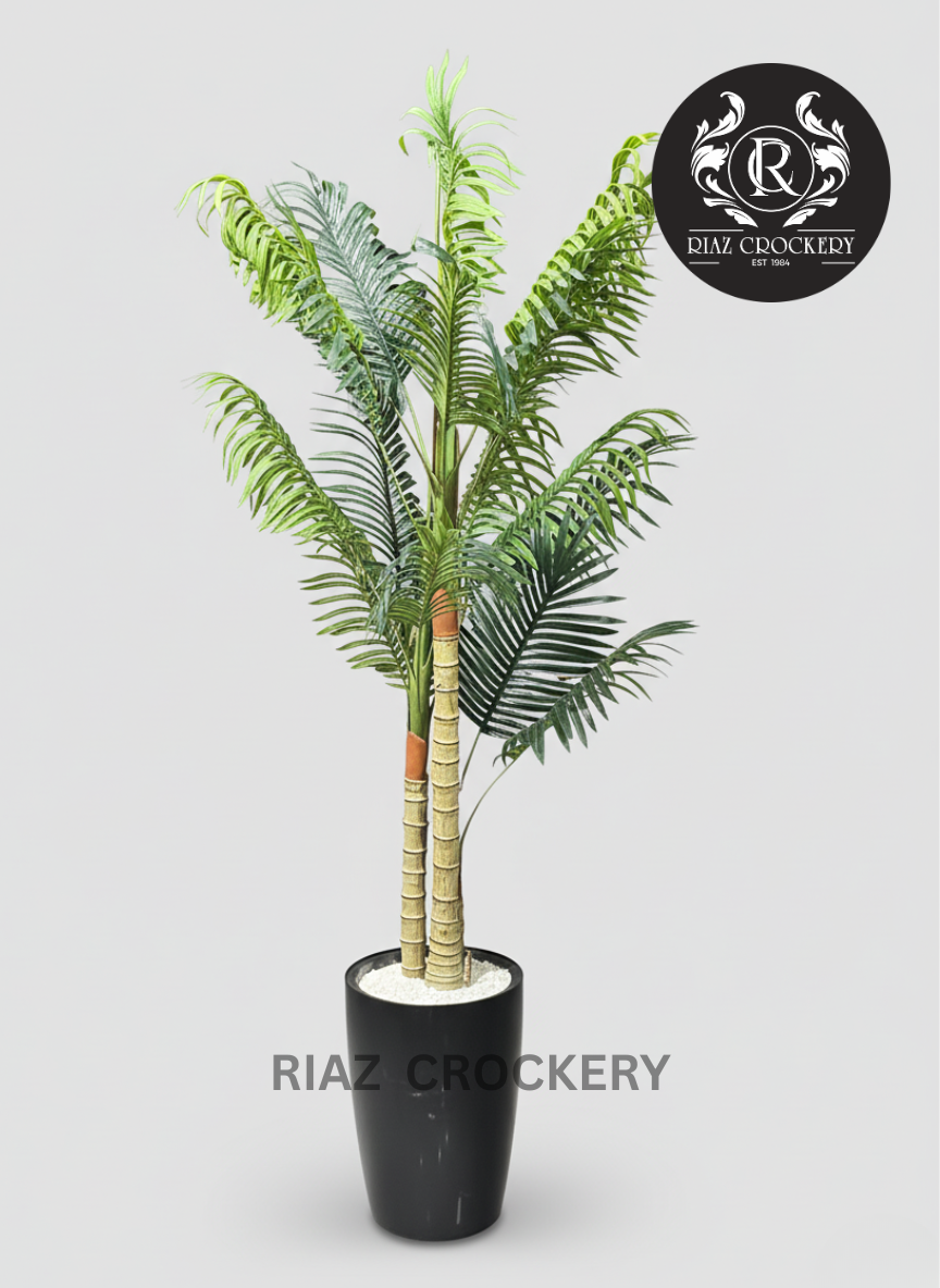 This is a tall, fake coconut palm tree, standing about 6 feet high, bringing a tropical feel to any room. It has long, green leaves like a real palm tree, coming from two light-colored, fake trunks that look like bamboo. The tree sits in a simple, tall black pot. It's a great decoration to make your space feel like a sunny beach, and it needs no watering or care.