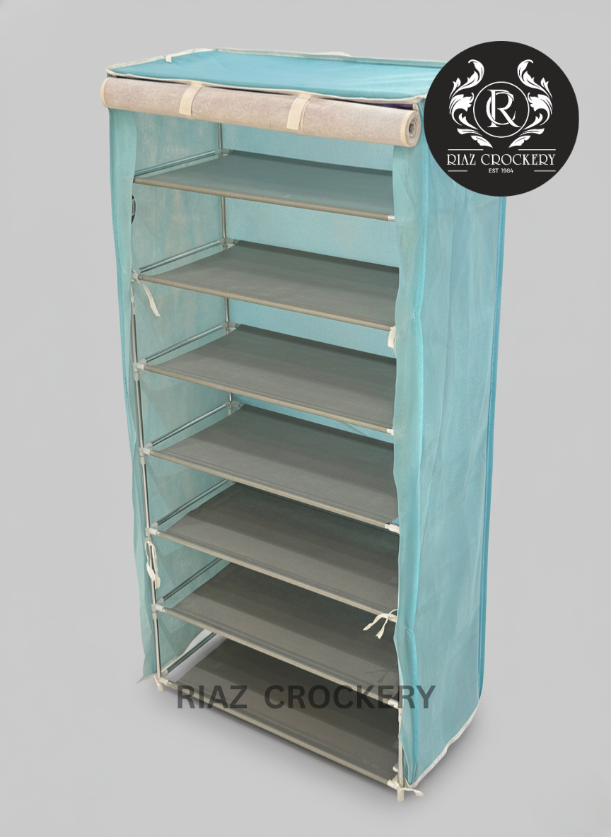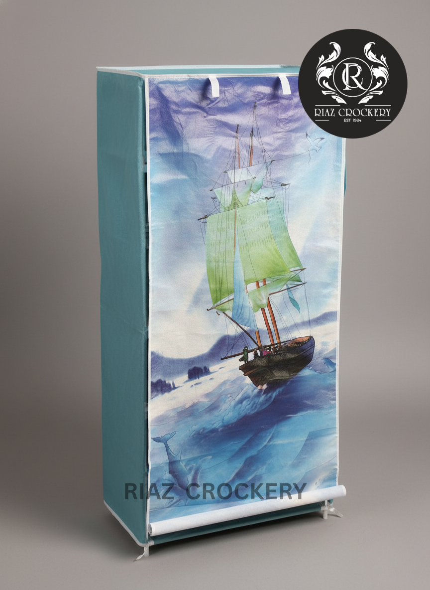 This is a smart and handy Covered Shoe Rack that helps keep your shoes tidy and dust free. It has many shelves inside for your shoes and a light blue fabric cover to protect them. The front cover can roll up to let you easily reach your shoes, and it can also feature a cool design, like a ship on the ocean, adding a decorative touch when closed. It's easy to set up and great for any room where you need extra shoe storage and protection.