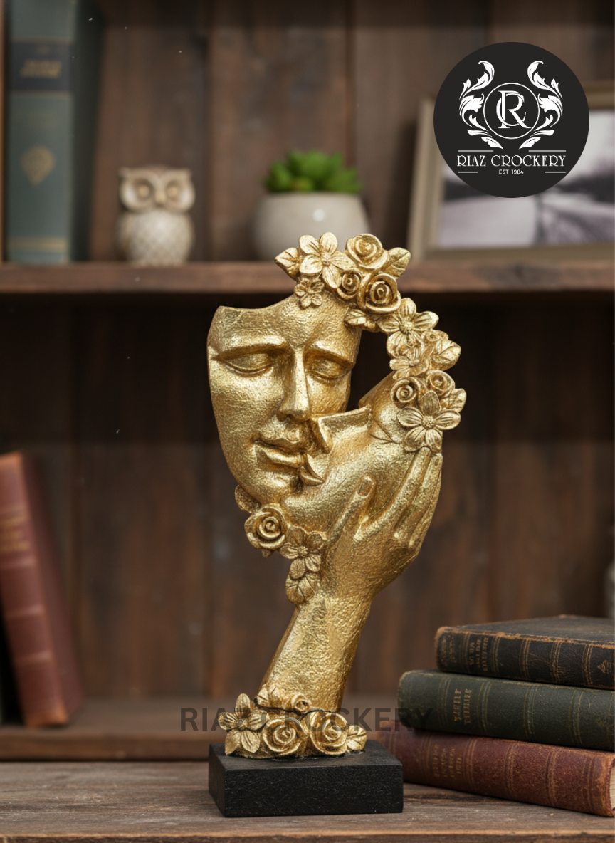 Make your home look special with this pretty golden face decoration. It's a shiny gold face with a hand covering part of it, and lovely gold flowers are all around. It sits nicely on a strong black stand. This piece is perfect for adding a bit of art and mystery to your table or shelf, making any room feel fancy and interesting.