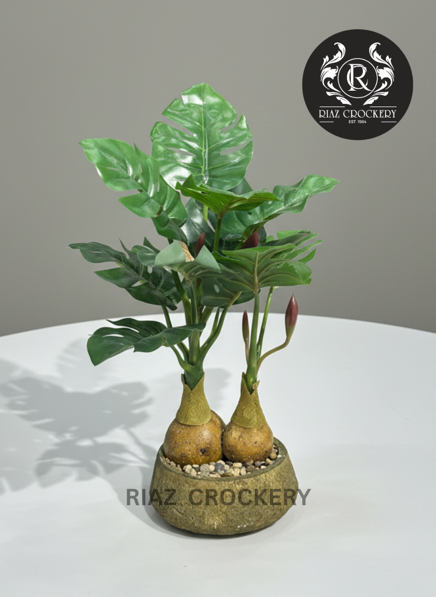 This is a really cool artificial planter featuring vibrant green split-leaf foliage, emerging from unique bulb-like bases. It sits in a stylish textured stone-like pot, perfect for adding a natural and unique touch to any room without needing care.