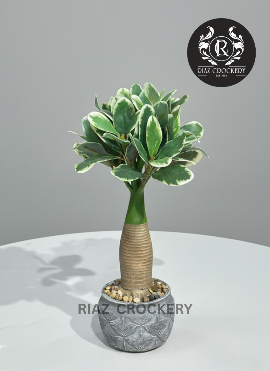 This is a really cool artificial planter with vibrant green leaves edged in white, sitting in a stylish grey ceramic pot with a braided pattern. It's perfect for adding a fresh, elegant touch to any room without needing care.