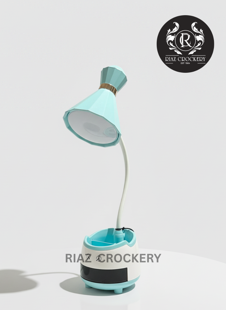 This cute and handy desk lamp comes in a refreshing light blue and white. It has a fun, curvy base with a little holder for your pens or small things, and a spot for your phone. A bendy white arm reaches up to a stylish, cone shaped light head that gives a nice, clear light. It's perfect for making homework, drawing, or reading brighter, keeping your space tidy, and even holding your phone while you work.