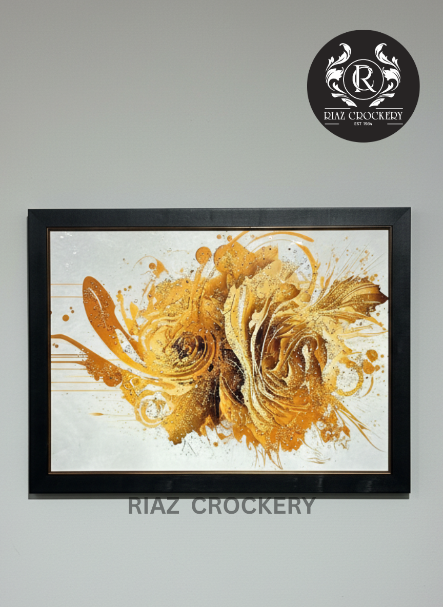 This radiant wall frame features an explosion of abstract golden forms, resembling a dynamic, blossoming flower. Swirls of rich gold and shimmering highlights create a sense of movement and luxury against a soft background. This framed artwork is a bold statement piece that adds warmth, elegance, and a touch of modern artistry to any room, reflecting light and catching the eye with its intricate details.