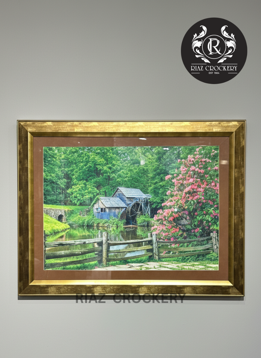 This charming wall frame captures a serene and picturesque scene of an old mill with a working waterwheel, nestled beside a tranquil pond. Surrounded by lush green trees and a vibrant pink flowering bush, the rustic blue mill creates a focal point of peaceful country living. Framed in elegant gold, this artwork evokes a sense of nostalgia, natural beauty, and quiet charm, perfect for adding a touch of rustic appeal to your home.