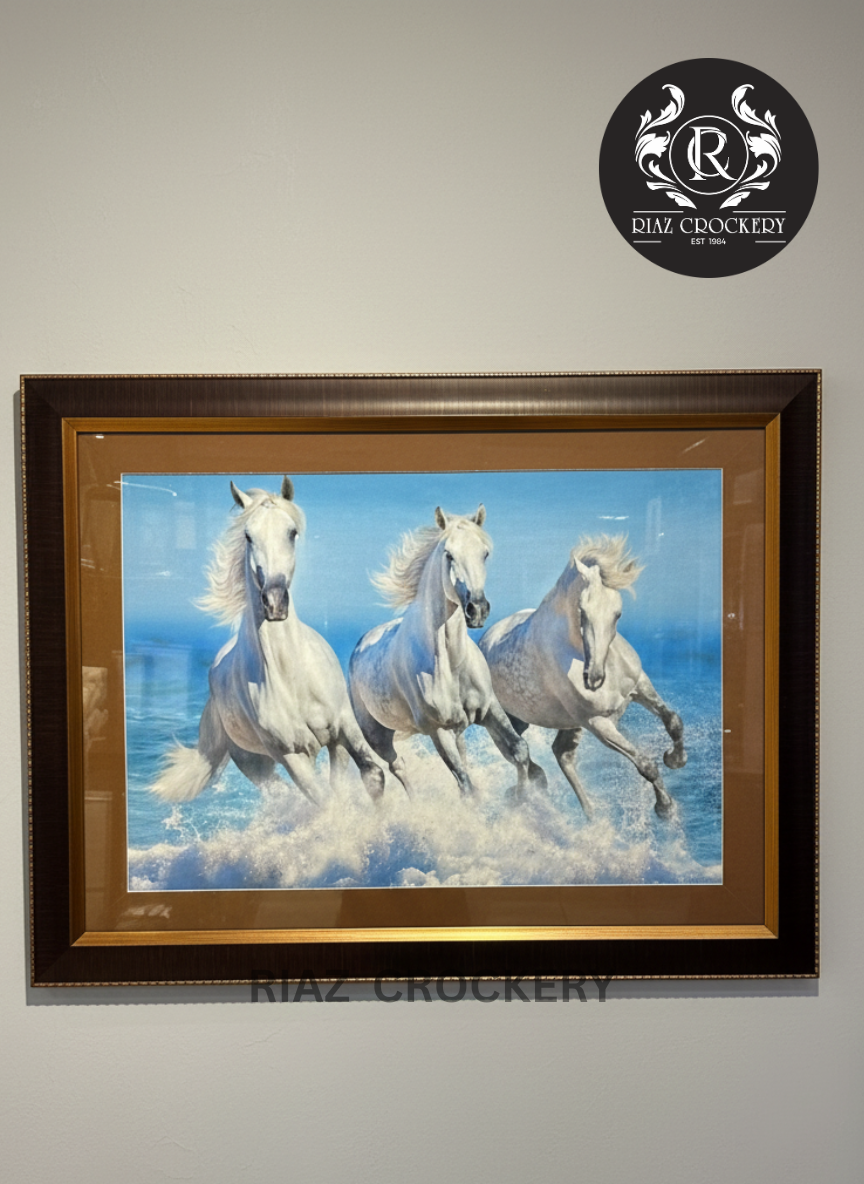 This stunning wall frame captures the wild beauty and power of three majestic white horses galloping through crashing ocean waves. Their flowing manes and tails blend with the sea foam, creating a dynamic and breathtaking scene against a clear blue sky. Framed in a rustic dark wood, this artwork brings the invigorating energy of the sea and the freedom of these magnificent creatures into your home.