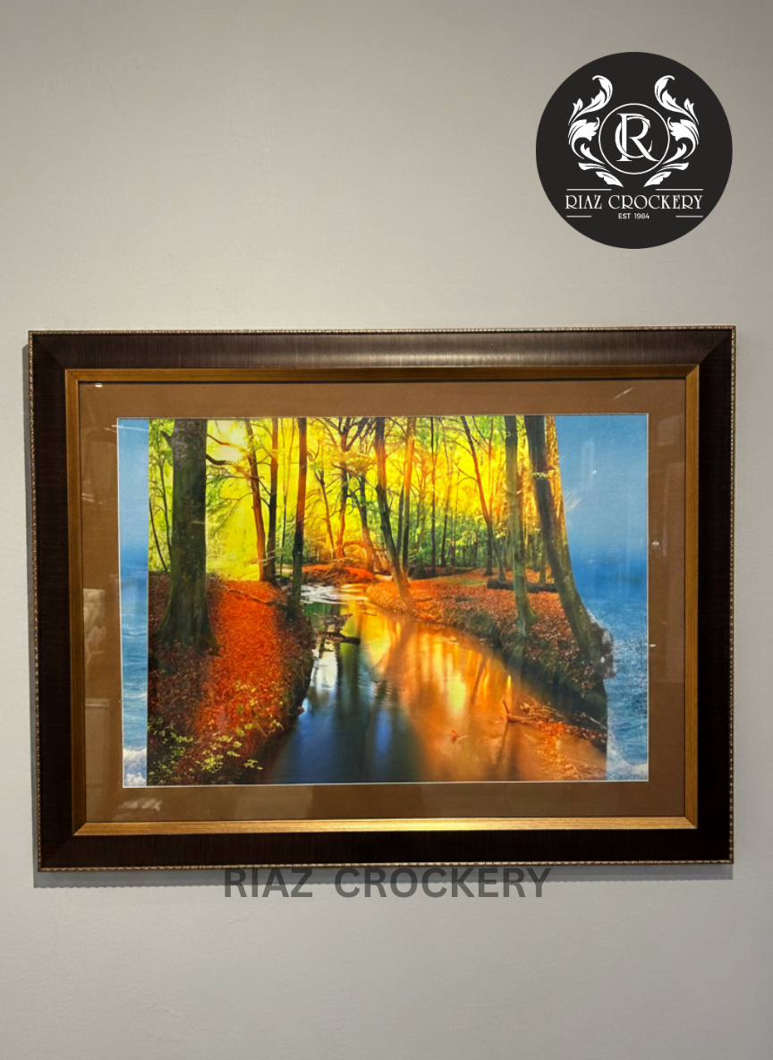This captivating wall frame transports you to a vibrant autumn forest where a serene stream gently flows. The trees glow with brilliant golden and orange leaves, creating a stunning reflection on the water's surface, while fallen leaves carpet the banks in warm hues. Framed in a rustic dark wood, this artwork evokes a sense of peace, natural wonder, and the cozy beauty of fall, perfect for bringing the warmth of the season into your home.