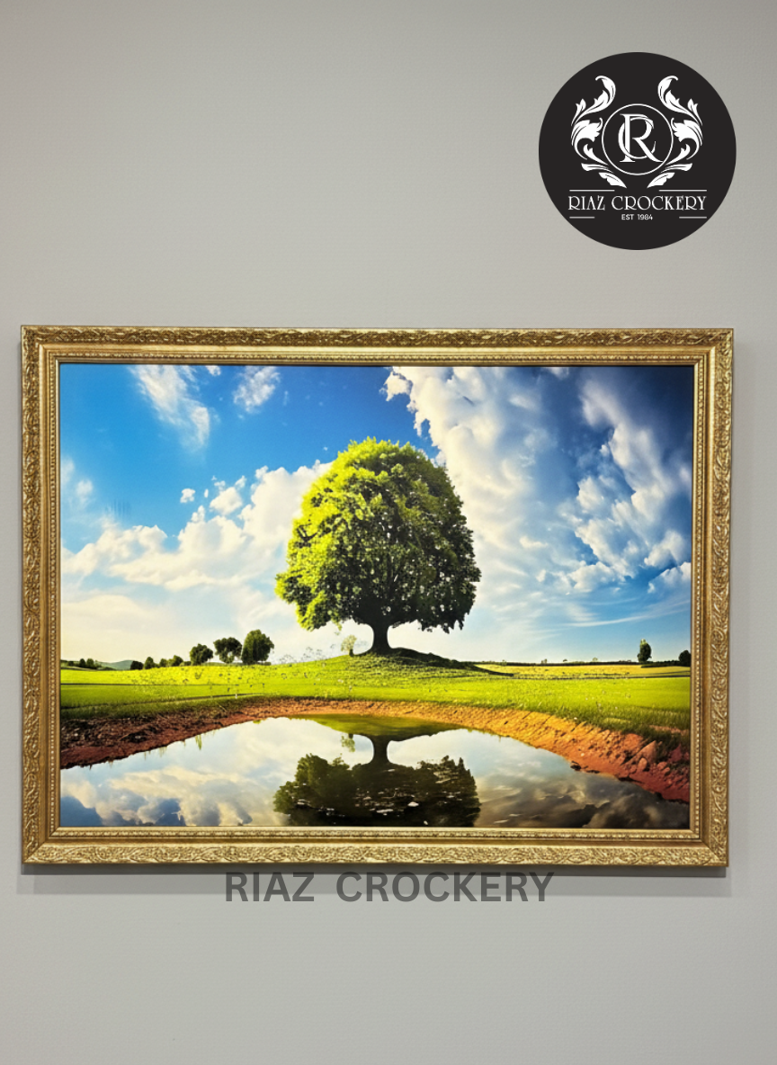 Bring the serene beauty of nature indoors with this stunning diamond wall frame. It showcases a vibrant green tree standing majestically beside a tranquil pond, perfectly reflecting the bright blue sky and fluffy white clouds. The special diamond finish adds a captivating sparkle, making the scene truly come alive with light and color.