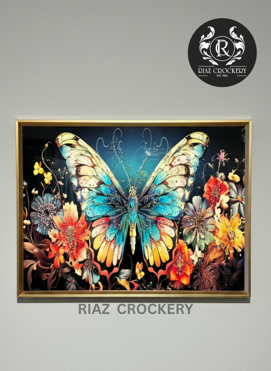 Adorn your walls with the enchanting beauty of this diamond wall frame, featuring a magnificent butterfly with wings shimmering in vibrant blues, yellows, and oranges. Surrounded by an array of colorful, blooming flowers against a dark, mystical background, this piece creates a captivating contrast. The special diamond effect makes the butterfly and flowers sparkle, bringing a magical touch to any room.