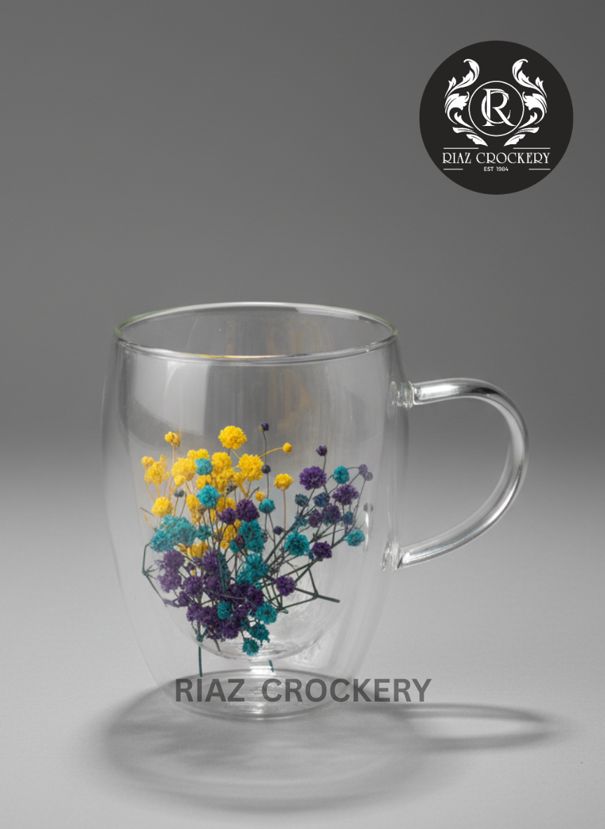 Brighten your day with the delightful "Rainbow Bloom" Double Glass Mug. This special mug holds a vibrant bouquet of real dried flowers in sunny yellow, cheerful blue, and rich purple, nestled between its two layers of clear glass. It's like having a mini garden for your drink! This smart design keeps your beverages perfectly hot or cold, while the flowers dance around, creating a beautiful view with every sip. It's a truly joyful way to enjoy any drink.