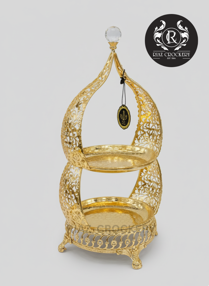 This super fancy golden dish has two steps, perfect for showing off your favorite sweets or small snacks. It's made of shiny gold metal with beautiful patterns carved into it, looking very elegant and rich. At the very top, there's a clear, sparkling gem that catches the light. This dish is great for making any party table look extra special, or just adding a touch of glamour to your home. It's a real showstopper for serving tasty treats.