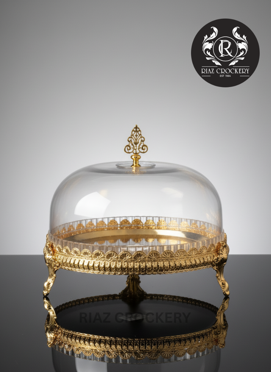 This beautiful golden cake dish is perfect for showing off your cakes and sweets! It has a fancy gold stand with pretty details and sits on small golden feet. A clear dome lid with a gold handle keeps your treats fresh and looking great. It adds a very rich and elegant look to any table, making every dessert special.