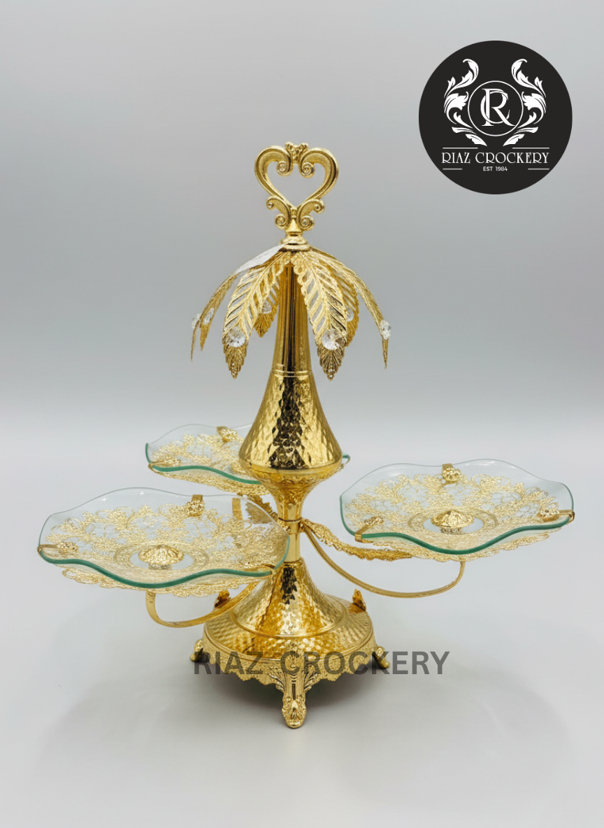 Present your dry fruits and treats with ultimate sophistication using this exquisite Golden Dry Fruit Set. This multi-tiered serving stand features three delicately patterned glass plates, each with an ornate golden rim and central design, perfect for showcasing a variety of snacks. These plates extend elegantly from a gleaming golden central stand, which boasts a hammered texture, leaf-like accents with sparkling jewels, and a decorative heart-shaped handle at the top. Resting on an ornate golden base, this set is a magnificent centerpiece, blending luxurious design with practical serving.