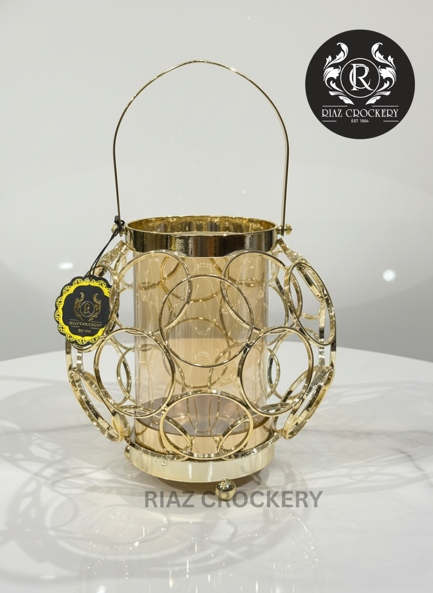 This beautiful golden metal candle stand adds a touch of charm and light to any room. It has a round, open design made of shiny gold rings, with a handle for carrying. Inside, a tall, amber-colored glass holder keeps your candle safe. It's perfect for creating a cozy glow on tables, shelves, or hanging in your home.
