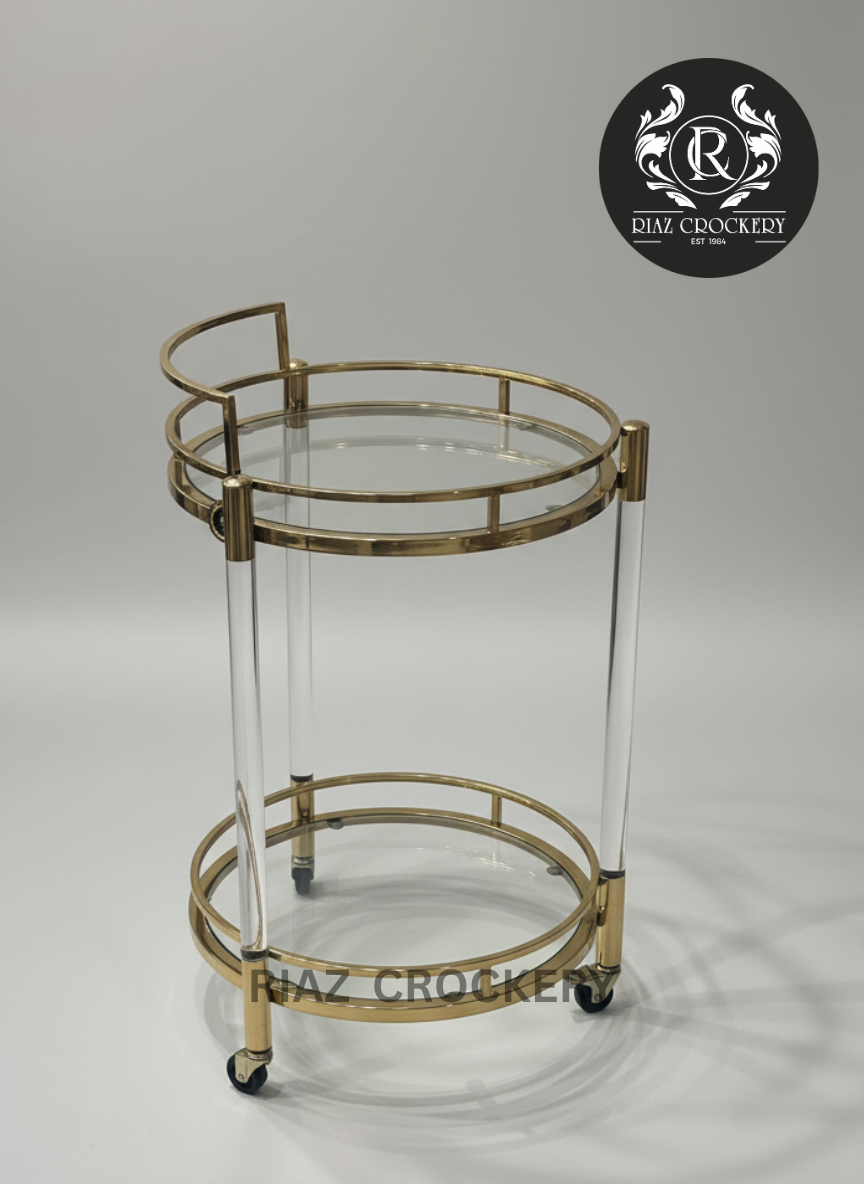 Serve with modern flair using this gorgeous Golden Metal Tea Trolley. It features clear shelves and clear support poles, all framed by shining golden metal. This trolley seems to float, making it perfect for showing off drinks, snacks, or fancy decor, adding a bright and open feel to any room.