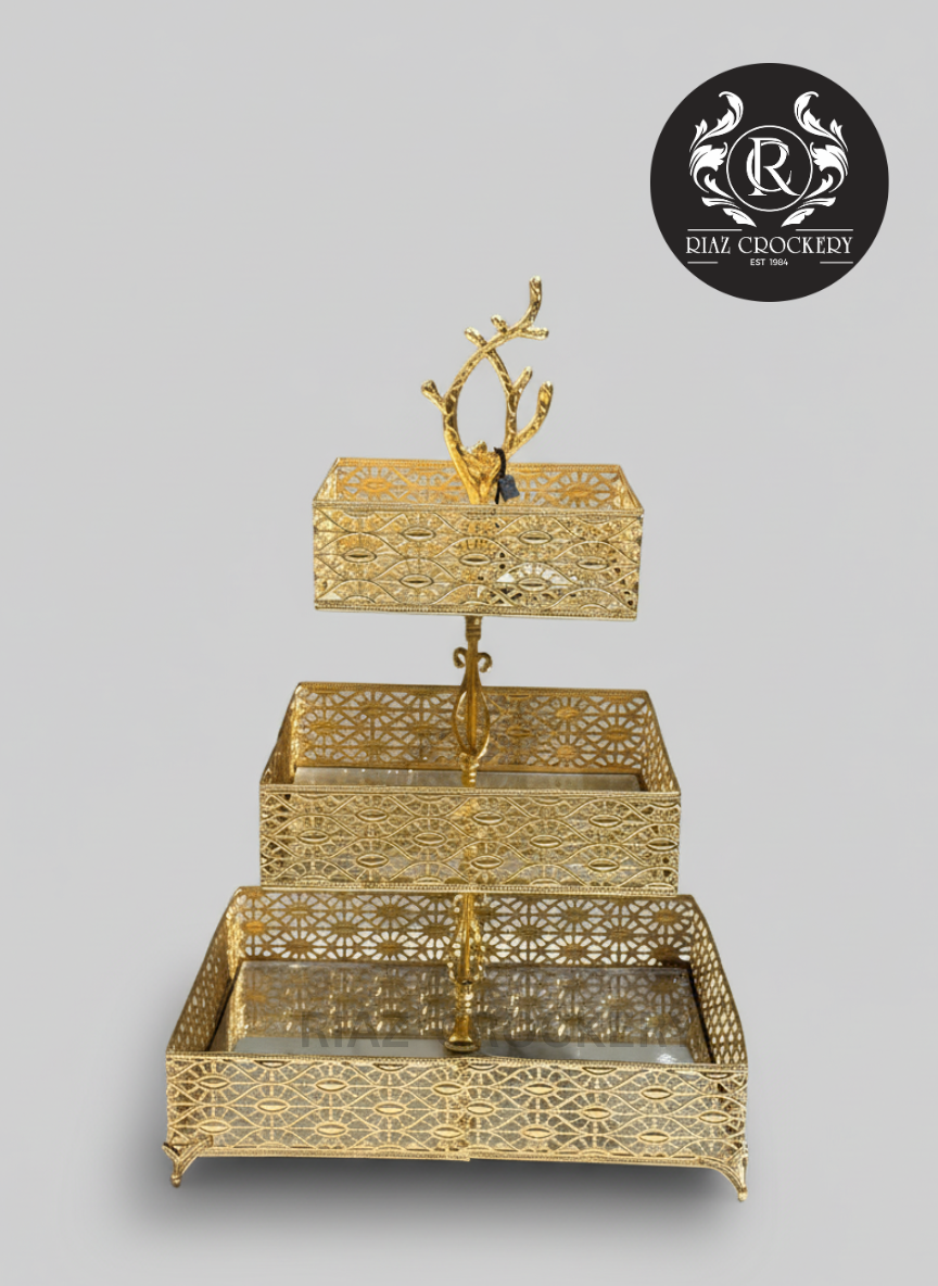 This dish is super shiny and looks amazing! It's perfect for showing off all your yummy sweets, nuts, or small snacks. Because it's gold and has mirrors, everything you put on it looks extra special and beautiful. With three levels, you can put lots of treats out for everyone!