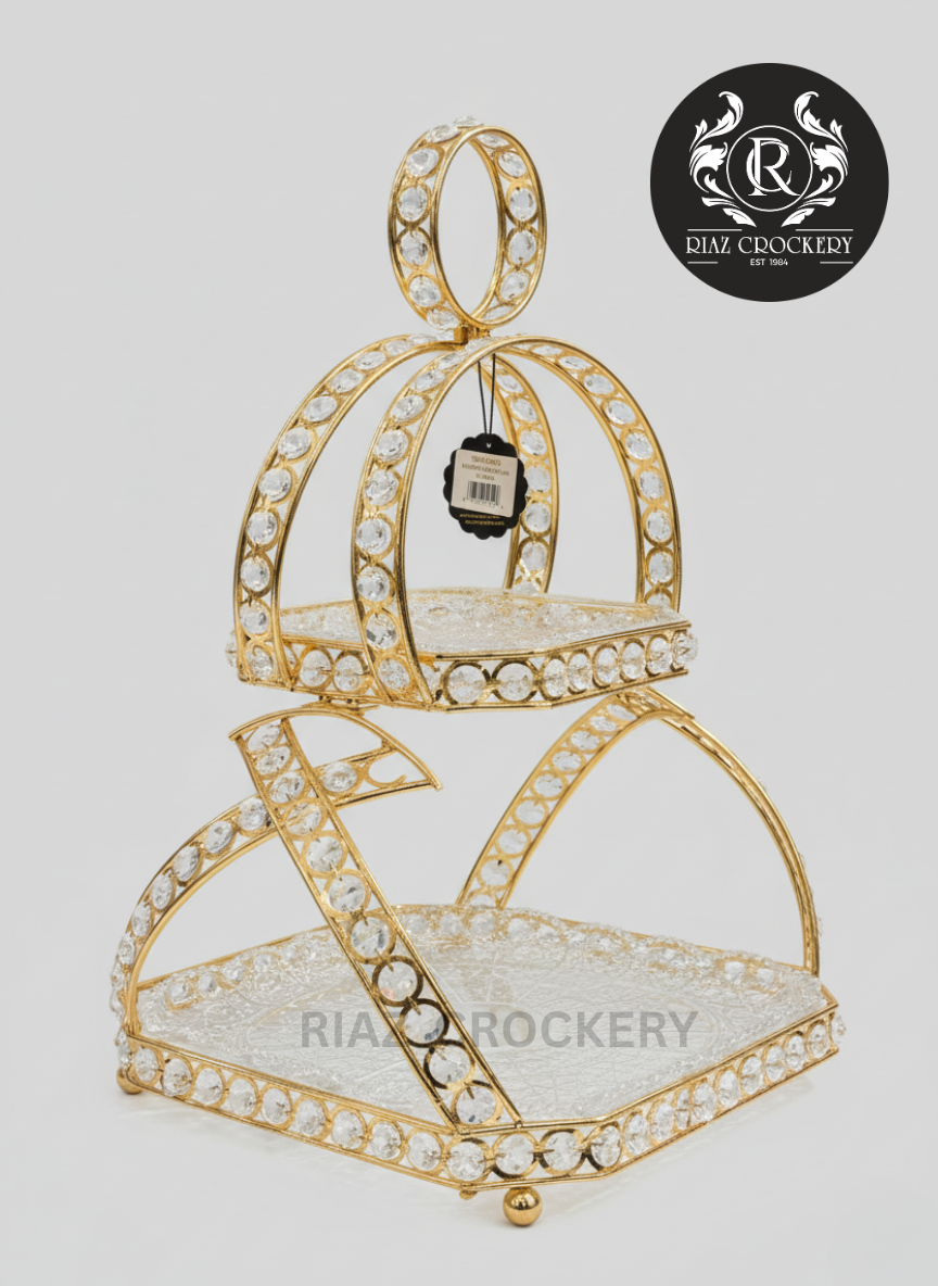 It has two square glass plates, each with a lovely pattern on them. These plates are held up by a golden frame that is decorated all over with clear, shiny crystals. The frame creates two levels, making it easy to display lots of goodies. At the top, there's a fancy golden ring, also covered in crystals, for a touch more sparkle and easy carrying. The bottom has small golden feet to keep it steady. This stand isn't just for food; it's like a piece of sparkling jewelry for your table!