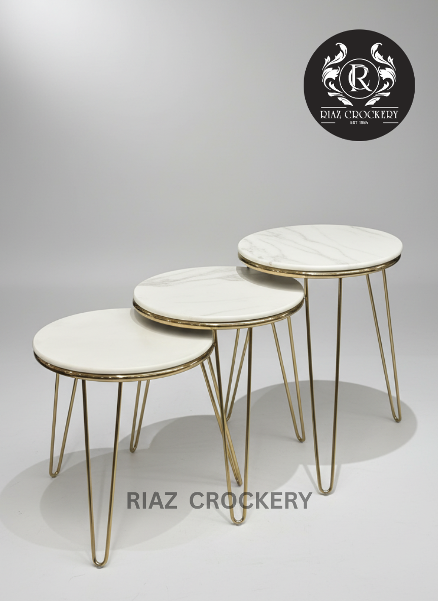 This set of three beautiful tables brings a touch of fancy style to your home. Each table has a shiny golden metal base with thin, hairpin legs, topped with a smooth, round white surface that looks just like real marble. These three tables are designed to be used side-by-side or spread out, adding flexible spots for snacks, drinks, plants, or decorations. They're a chic and practical addition to any living room, giving you lots of options for how to arrange your space.