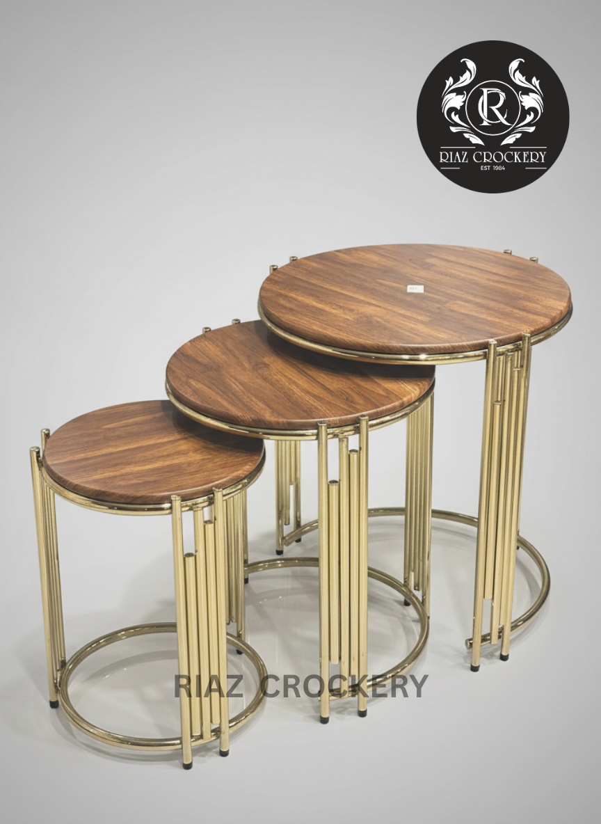 This is a lovely set of three round tables that look very fancy. Each table has a rich wooden top and a bright gold metal stand made of many thin poles. They fit inside each other, so you can use them all around your room or save space by stacking them. They are perfect for holding drinks, plants, or anything you want to show off, making your home look modern and grand.