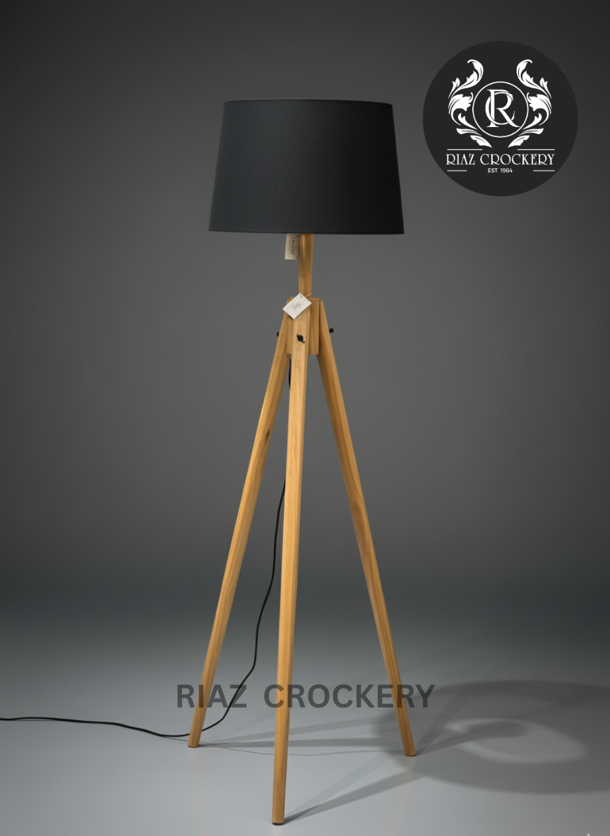 This stylish floor lamp features a modern tripod design with three sturdy ambose wood legs that provide stability and a warm, inviting aesthetic. It's crowned with a classic black drum shade, offering a chic contrast and diffused, ambient lighting suitable for contemporary living spaces.