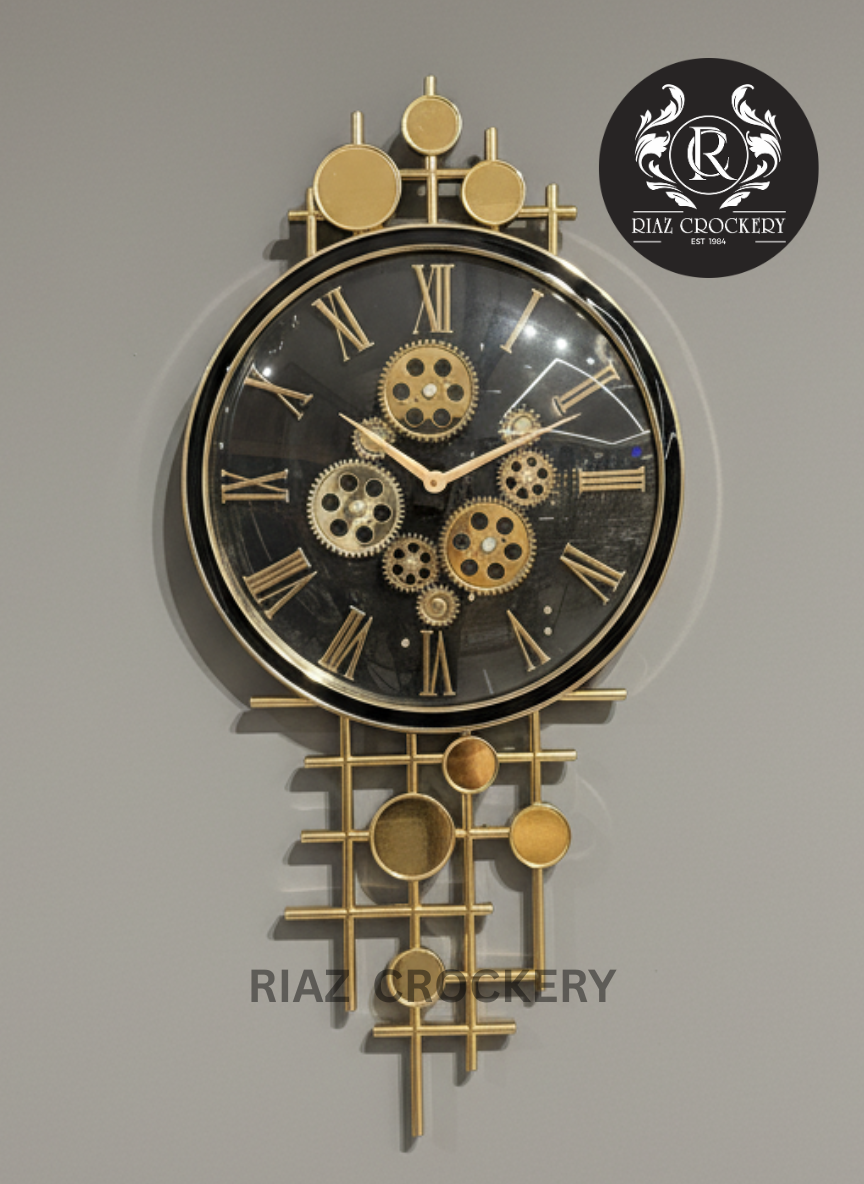 Visible Golden Gears: Fascinating gears move on the black clock face.