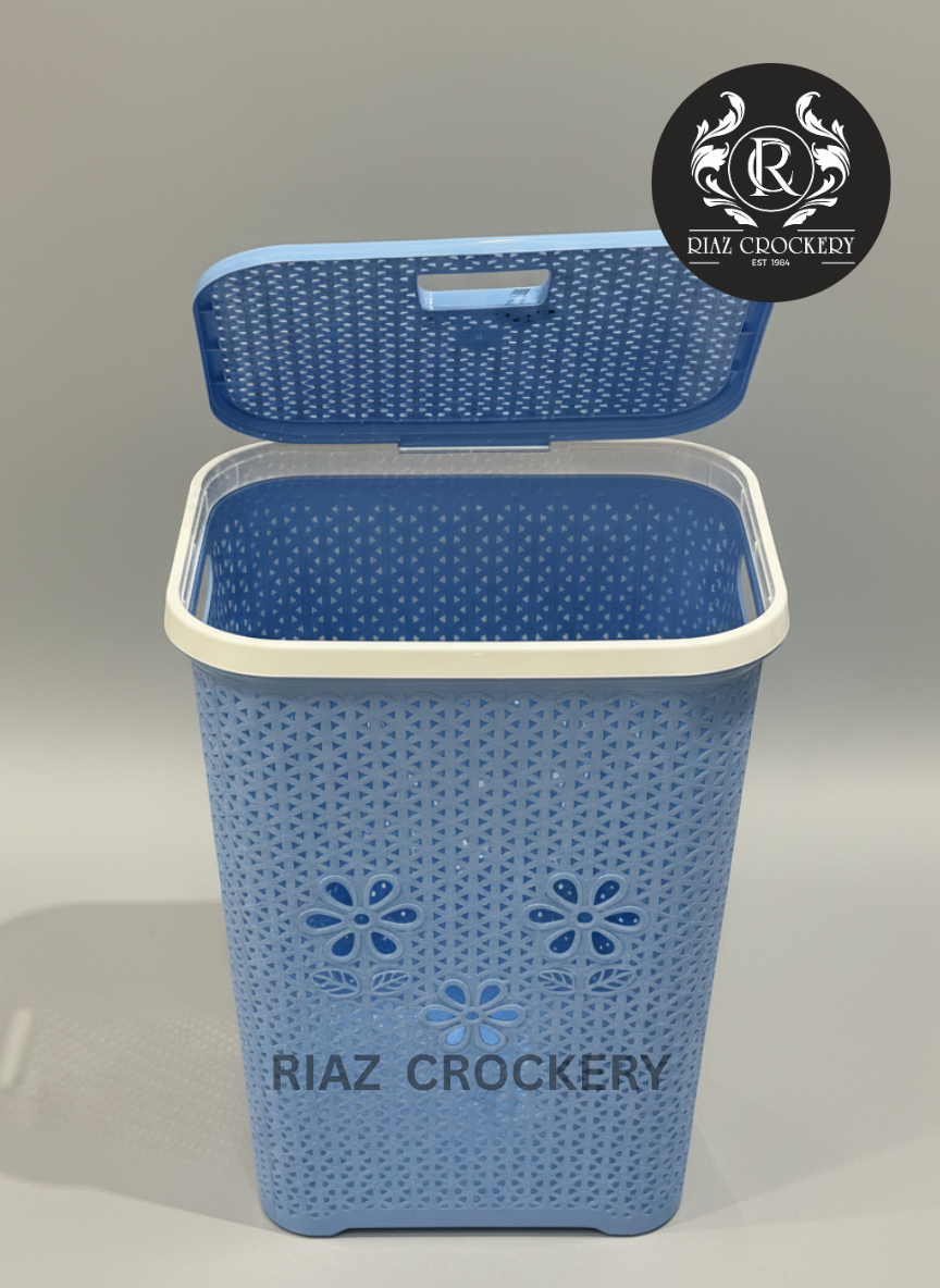 This is a pretty and useful laundry basket in a lovely light blue color. It's made of plastic, so it's easy to clean and won't get damaged by water. The basket has a cool pattern all over it, with some cut-out flower shapes near the bottom that make it look extra nice. It comes with a white rim and a matching blue lid that you can open to put your dirty clothes inside. The lid helps keep smells in and makes your room look tidier. The pattern also lets air get in, which is good for your clothes.