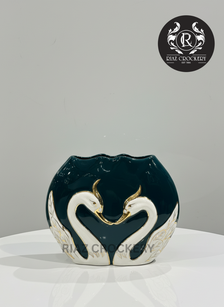 This is a really pretty green vase! It has a dark, shiny green color. On the front, there are two white birds (like ducks or swans) with gold lines on them, looking like they're giving a kiss. The vase has a soft, round shape and a wavy top. It's great for flowers and makes any room feel sweet and lovely.