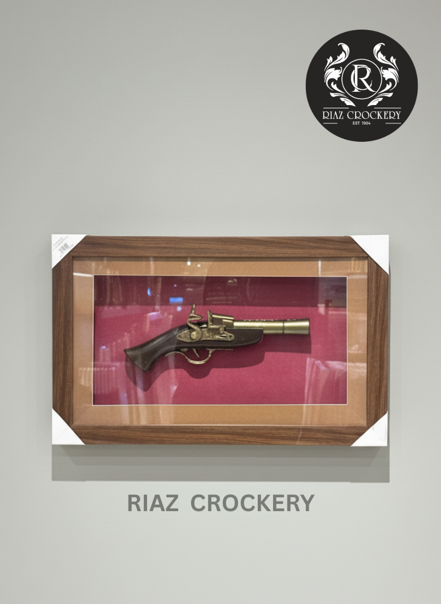 This charming wall hanging frame beautifully displays a decorative vintage pistol, highlighting its classic design and warm gold details. Set against a rich, earthy red background, the pistol is presented as a piece of historical art, evoking a sense of old-world charm and craftsmanship. Framed in elegant brown wood, this unique artwork is a perfect accent for adding a touch of history, a distinctive talking point, or a rustic yet refined element to any space.