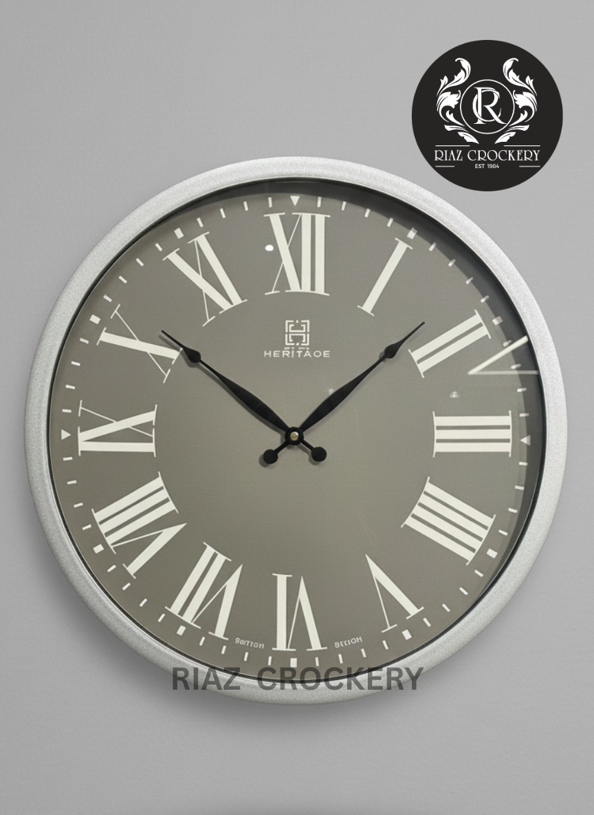 This Heritage Wall Clock is a simple and stylish clock that will make your room look fancy. It has a nice silver frame and a smooth grey face with classic numbers that look like letters. It's easy to read and brings a bit of old-fashioned charm to any space.