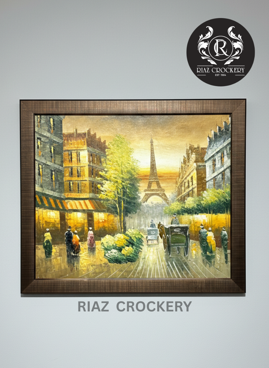 Experience the timeless beauty of a Parisian evening with this captivating handmade painting. It portrays a classic street scene with the majestic Eiffel Tower glowing in the distance, framed by old-world buildings and a horse-drawn carriage. The warm, soft light and visible brushstrokes create a romantic and dreamy atmosphere, perfect for adding a touch of elegance and nostalgia to your living space.