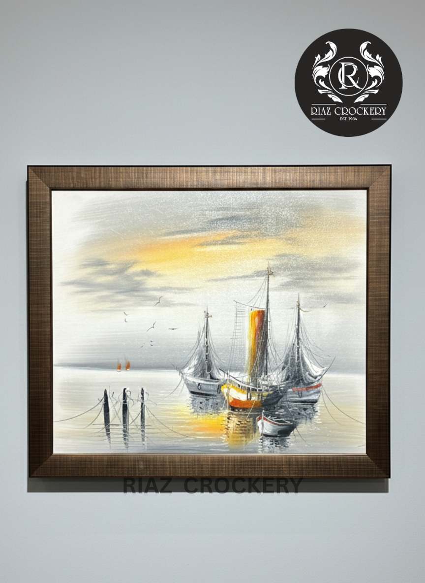 Drift away to a serene harbor with this exquisite handmade painting. It beautifully captures a quiet moment with several boats at rest on calm waters, bathed in the soft, warm glow of a setting or rising sun. The delicate balance of grey skies and vibrant highlights, coupled with textured brushstrokes, brings a peaceful maritime charm to any room.