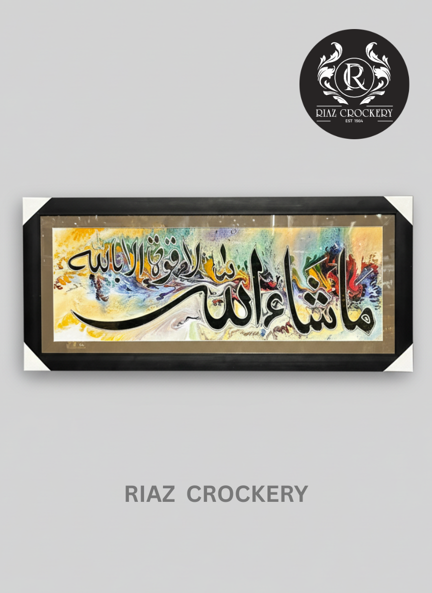 This vibrant Islamic wall frame is a striking piece of modern art. It features bold Arabic calligraphy, likely saying "Masha'Allah" (God has willed it) and other phrases, written in flowing black lines over a dynamic, colorful abstract background. The artwork is set within a sleek black frame, highlighting its contemporary appeal.