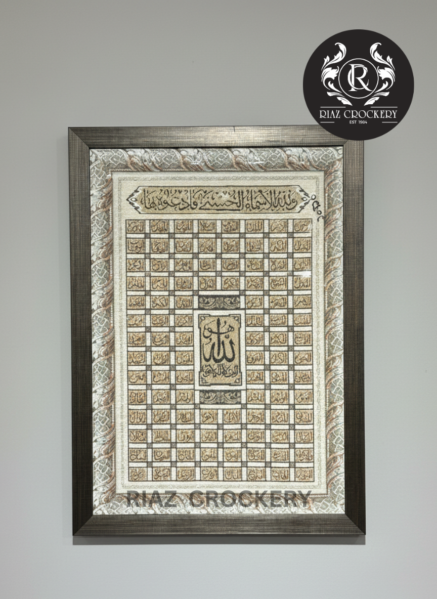 This beautiful Islamic wall frame, measuring 39*27 (likely in inches or cm), showcases an intricate grid of Arabic calligraphy, possibly representing the 99 Names of Allah or other significant verses. The detailed design is set against a soft, textured background with decorative borders, all encased in a tasteful dark frame.