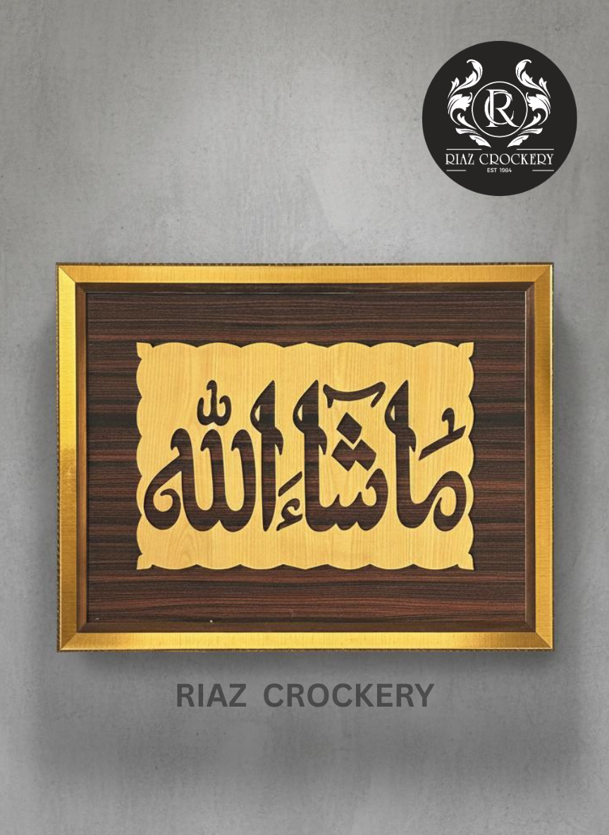 This charming Islamic wall frame is made from real wood, showing beautiful Arabic writing carved out in a lighter wood against a dark wood background. The wavy edges around the writing add a special touch, making it look both rustic and elegant. It's a natural and meaningful piece that brings warmth and spiritual beauty to any room in your home.
