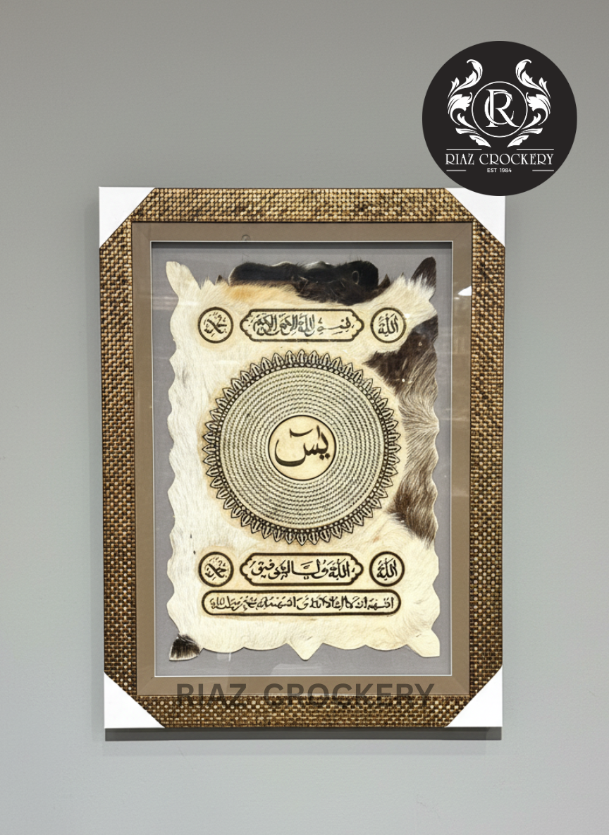 This unique Islamic wall frame, measuring 32*23 (likely in inches or cm), is a special piece with a rustic and spiritual feel. It features intricate Arabic calligraphy, including a prominent central design, all displayed on a textured material that looks like animal hide or parchment, with natural dark hair accents. The artwork is framed with a woven-patterned border and an outer white frame.